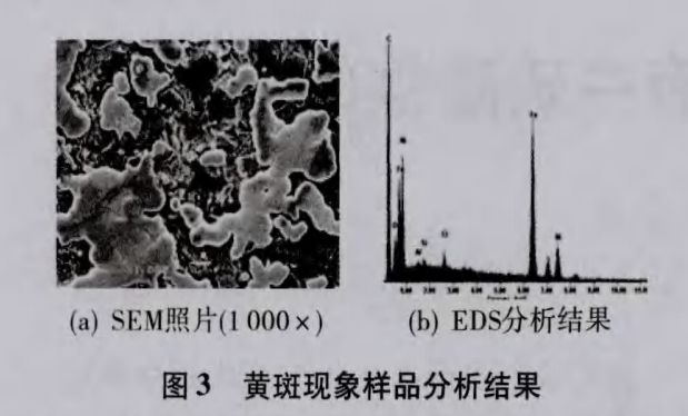 用扫描电子显微镜对不良样品进行分析,黄点、黄斑等异常K域的表而形貌见图3。