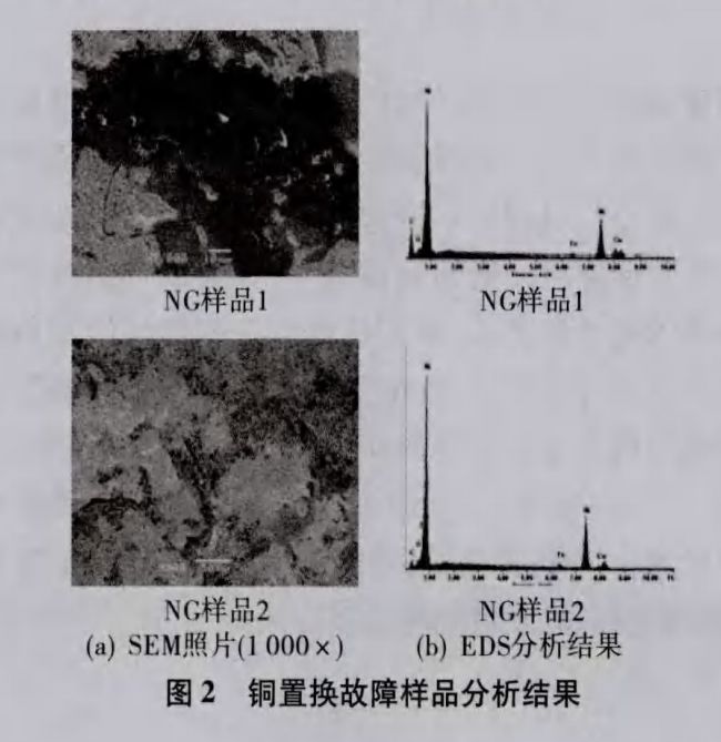 说明浅红色区域有铜元素,由于未经镀铜,电镀过程中有可能发生置换反应导致局部出现铜沉积,故把这类故障现象确定为铁与铜发生置换反应,导致置换铜发生氧化变色现象。