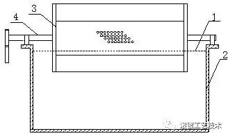 1-液面;2-镀槽;3-滚筒;4-主动轴